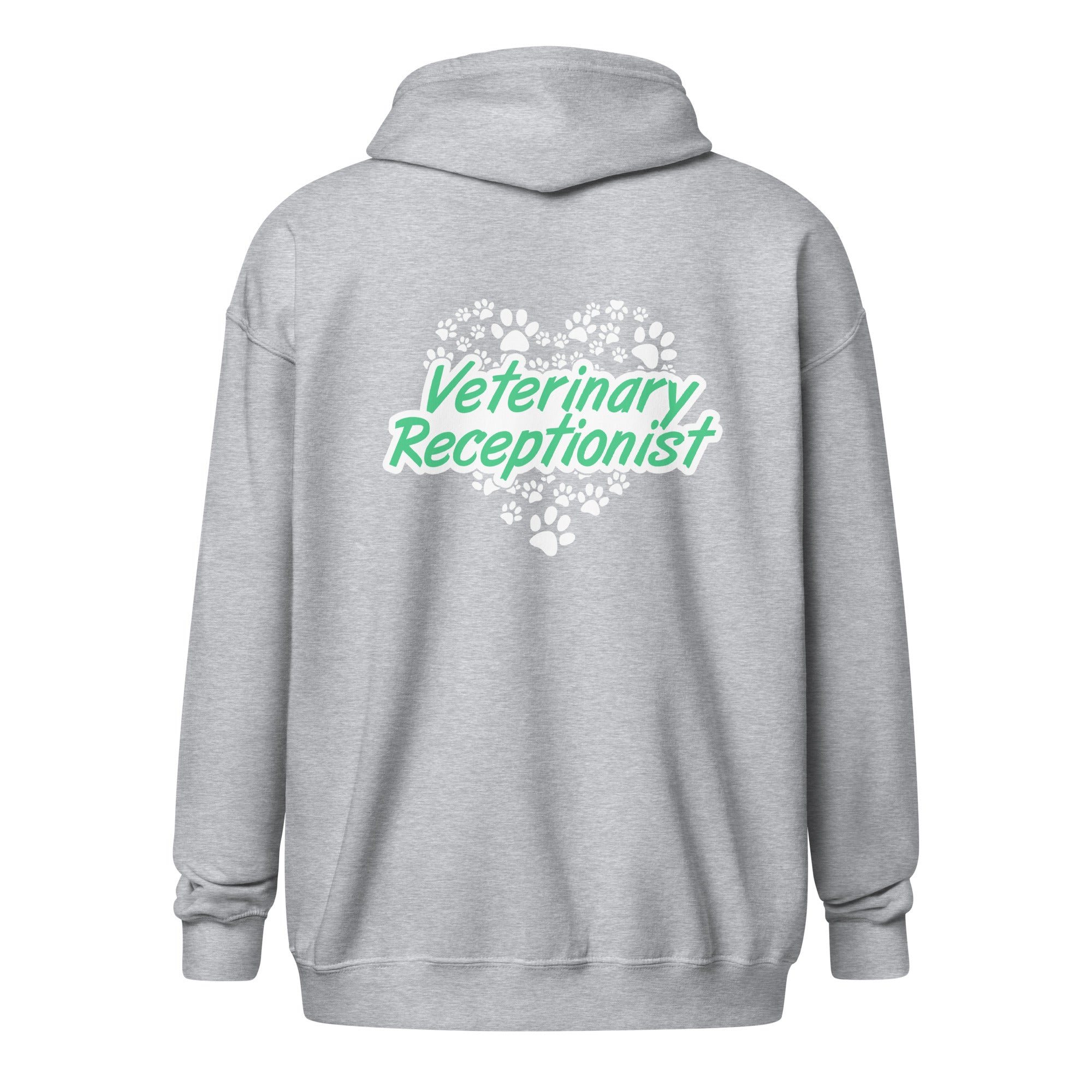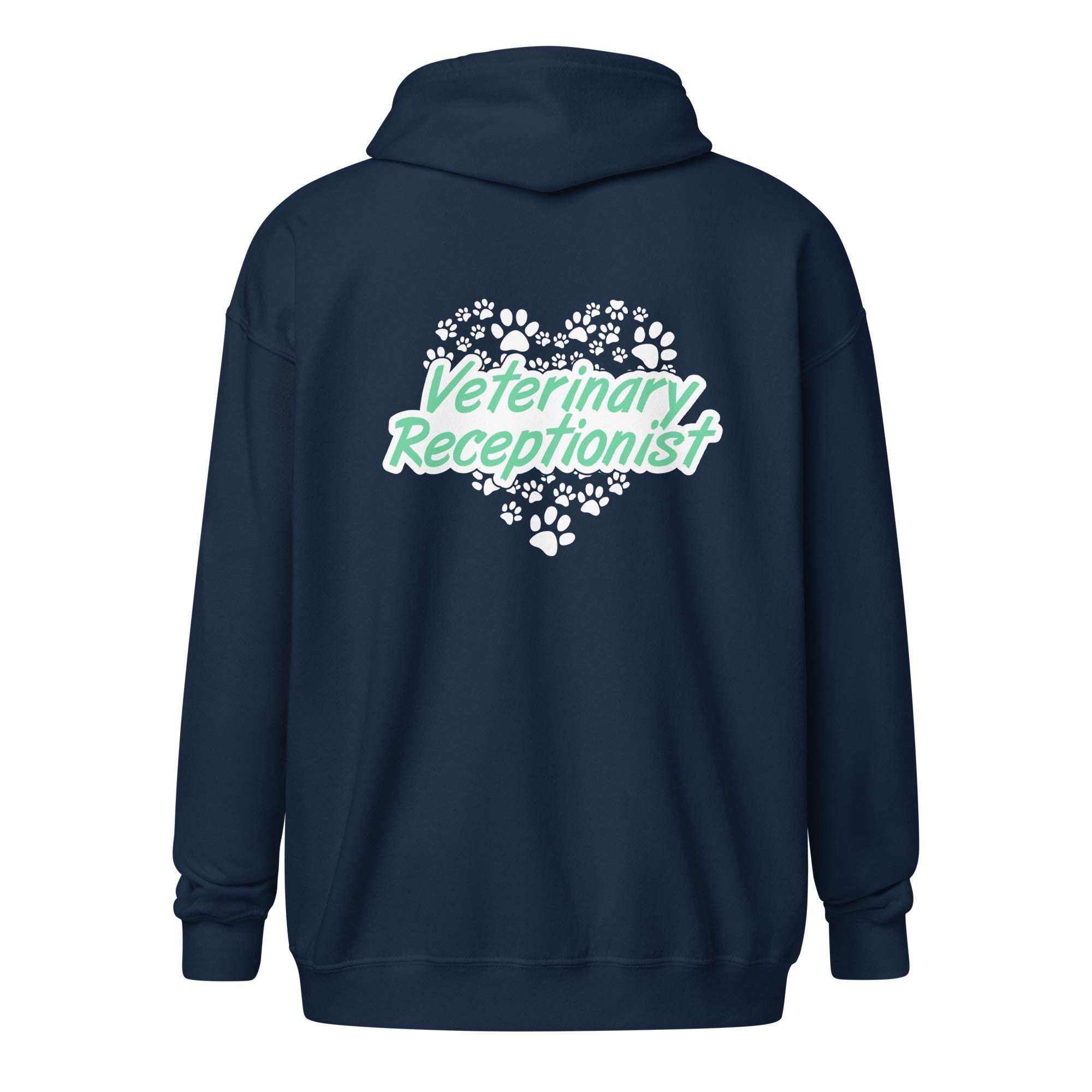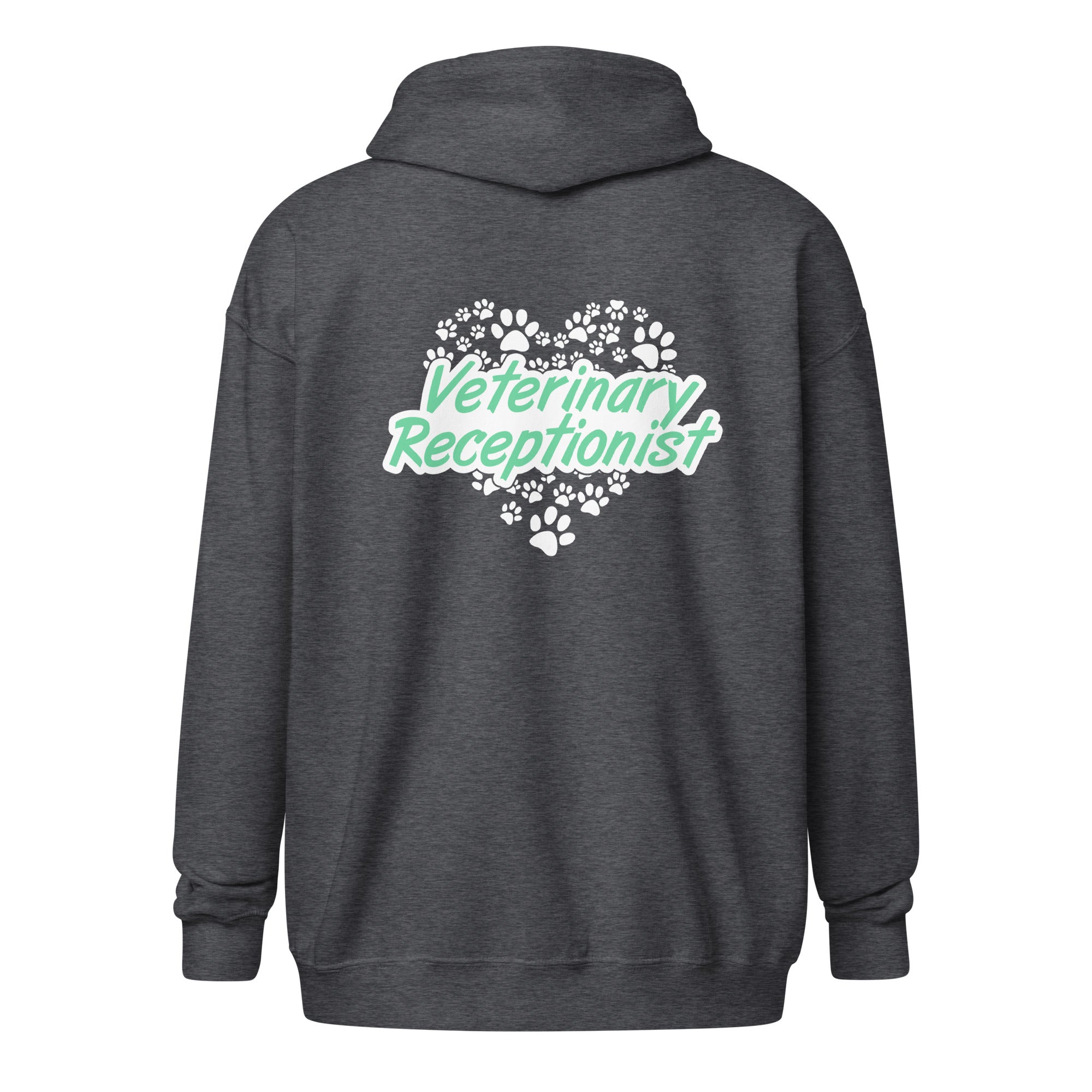 Show how proud you are to be a Veterinary Receptionist with this Veterinary Receptionist Heart Paws Unisex Zip Hoodie design. Wear this unisex zip hoodie at your place of work and entertain your colleagues with some vet humor. Perfect gift for Employee Appreciation Day, Vet Tech Week, World Veterinary Day for your Veterinary Staff. This will be your comfiest piece to wear after your scrubs! Unique design for everyone in veterinary medicine who loves their profession!